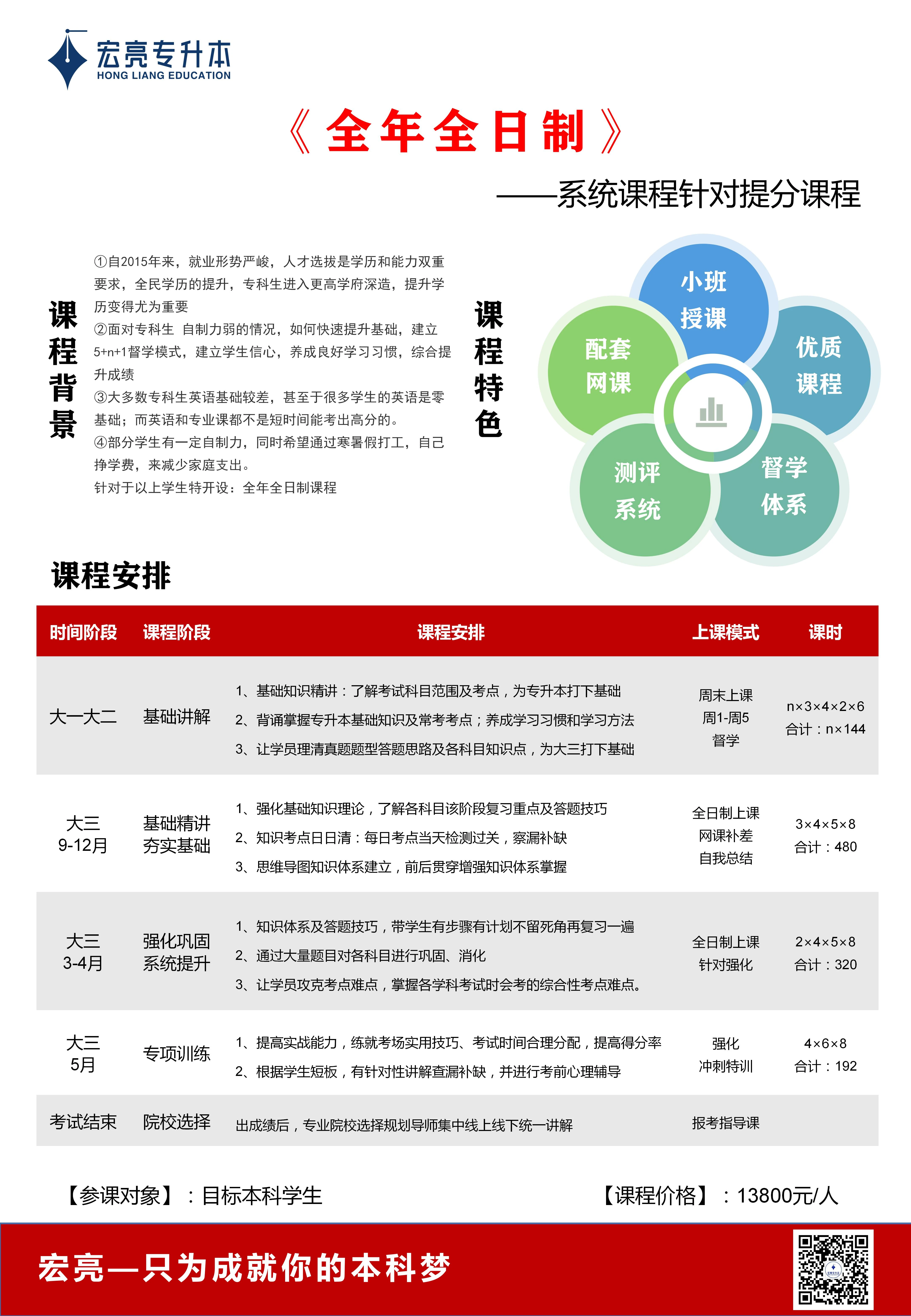 1、每天上课时间8小时外加1.5小时晚自习 2、9-4月份进行基础精讲,夯实基础 3、5月份进行习题训练、刷题训练、阶段测试 4、40人小班授课 |